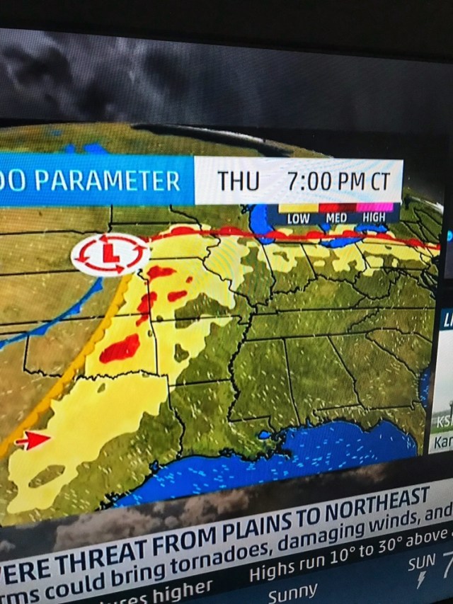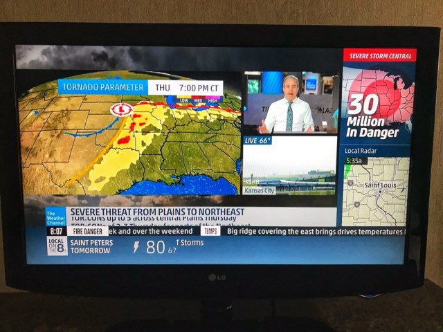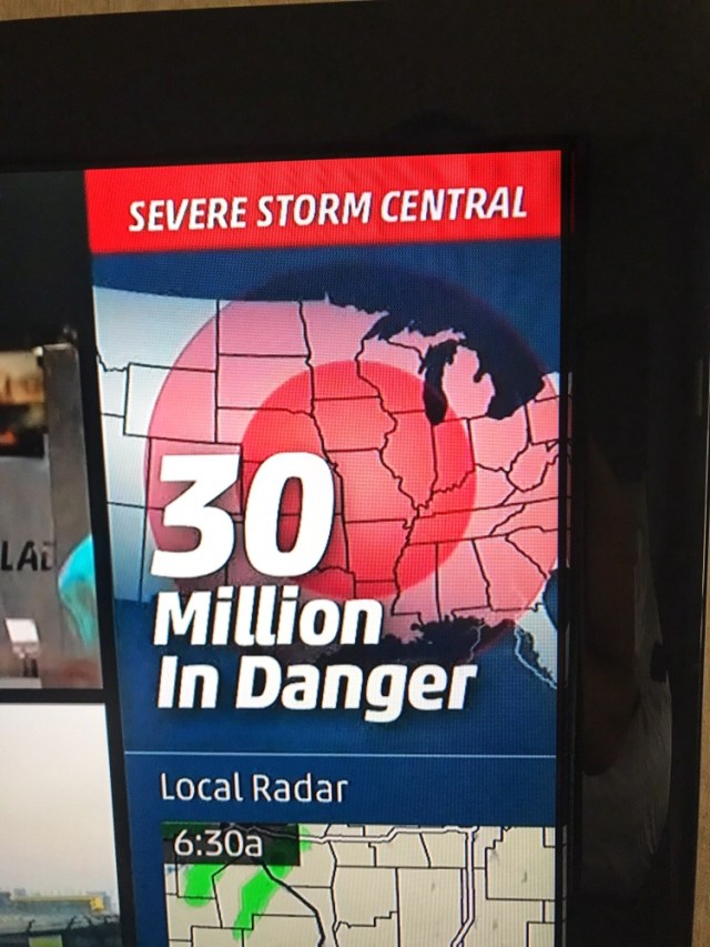 The Weather Channel is on the TV and things are getting bad as there are many tornadoes forming all around central U.S. Approximately 30 million people are in danger zones, some parts are even getting evacuated. This is just about three hours back from me.
